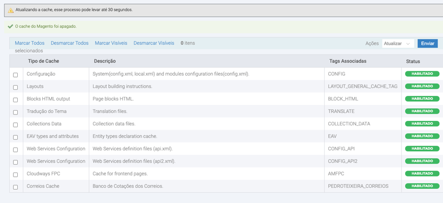 Irá processar a limpeza em 30s, e todos os tipos de cache ficaram verdes :)