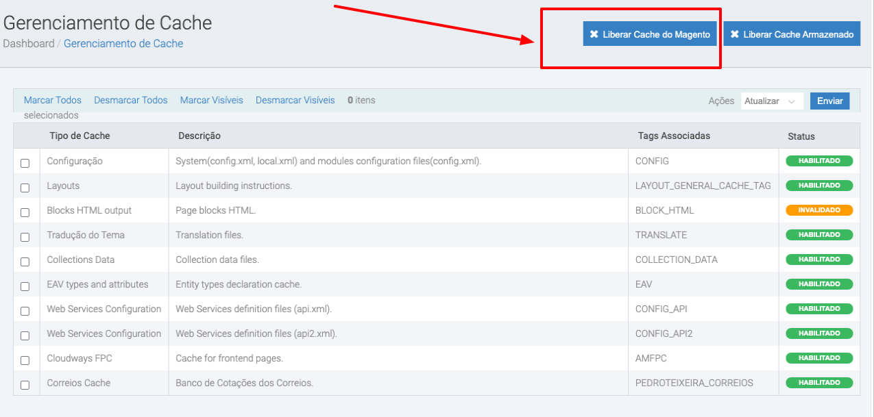 Para isso, após finalizar as mudanças, vá no menu Sistema / Gerenciar Cache e clique no botão Liberar Cache em destaque abaixo: