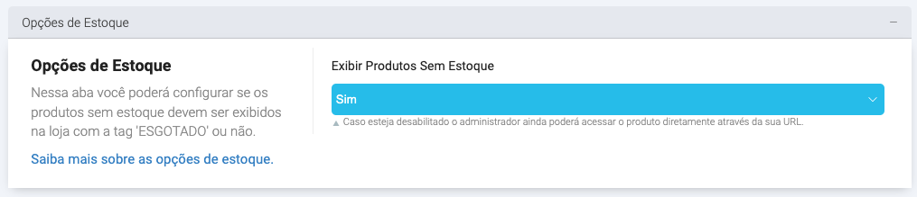 Exibir Produtos Sem Estoque: Neste campo você define: - SIM: para exibir os produtos esgotados, com a tag 'ESGOTADO' na loja virtual. - NÃO: para não exibir produtos esgotados na loja, ou seja, a loja exibe apenas os produtos que tem estoque disponível e disponibilidade "Em estoque".