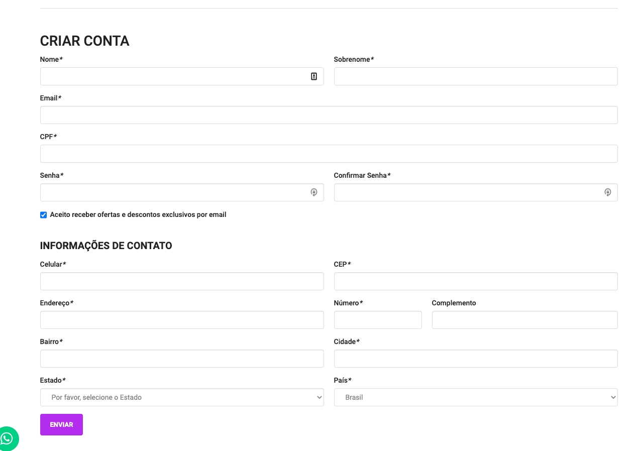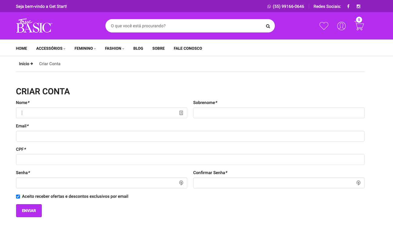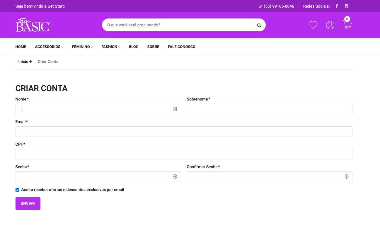 Por padrão, no menu "Minha Conta", a loja permite o cadastro simplificado, solicitando apenas os dados básicos do cliente.