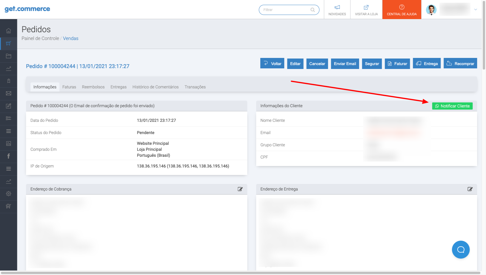 O objetivo destas mensagens é informar o status (andamento) do pedido para o cliente. E para enviar as mensagens é simples. Basta clicar no botão "Notificar cliente", que fica visível na tela de Pedidos, Faturas e Entregas.