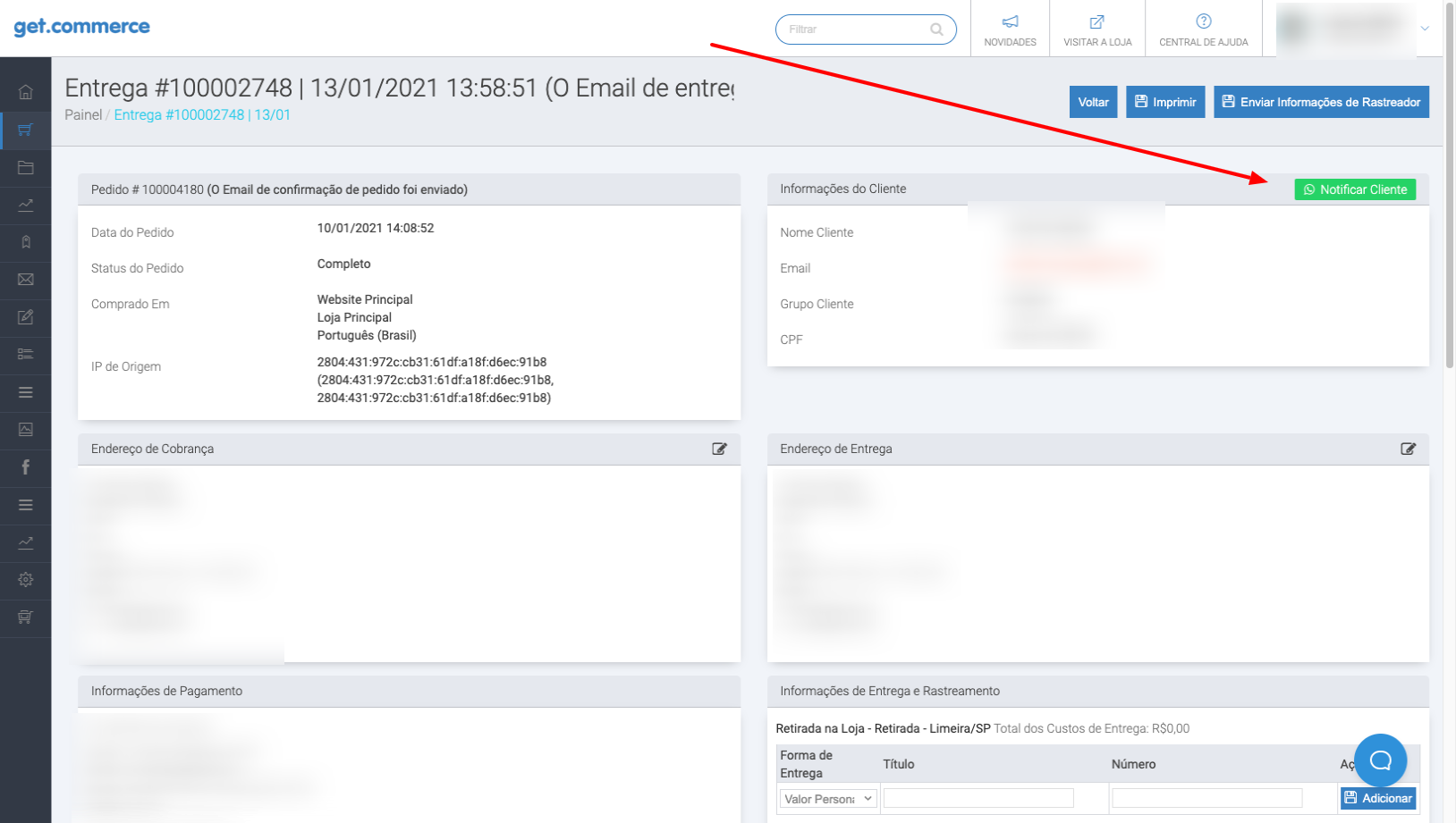 Junto ao campo Email Cliente, haverá o botão de notificação via WhatsApp em todos os contatos disponíveis.