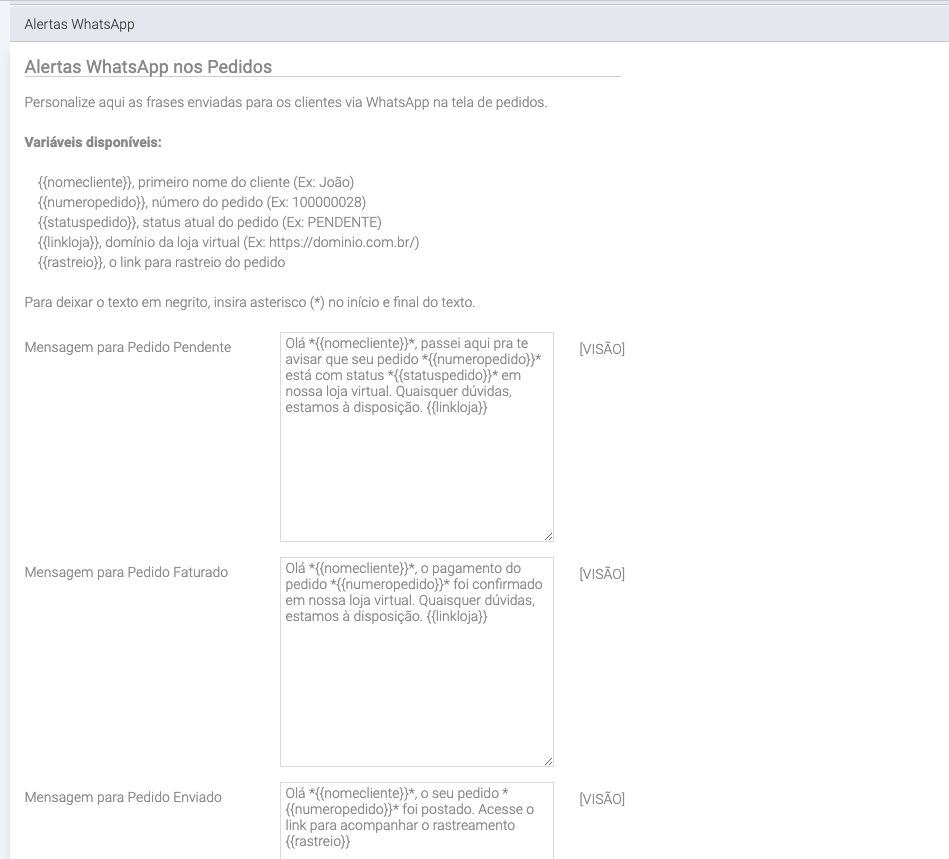 {{nomecliente}}, primeiro nome do cliente (Ex: João). Ou seja, automaticamente nas mensagens será exibido o nome do cliente, cadastrado no pedido.