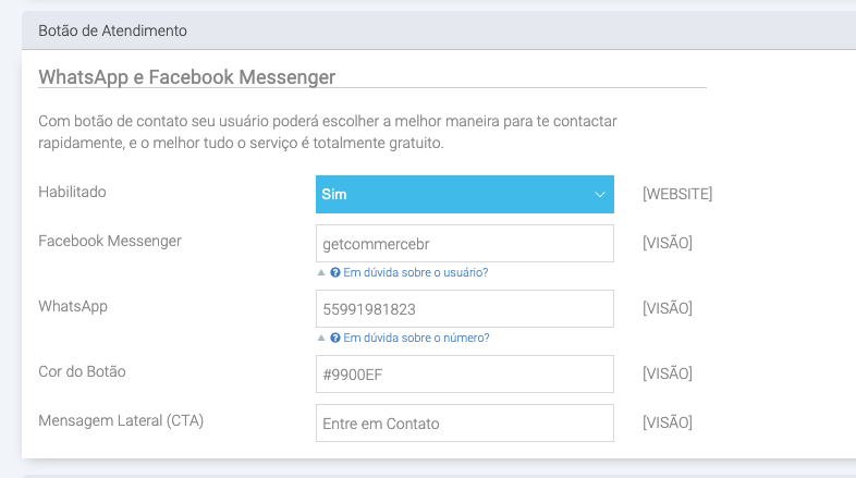 IMPORTANTE: Se você preencher apenas o número do WhatsApp, ficará apenas ele disponível. E se marcar preencher apenas o Facebook Messenger, apenas ele ficará disponível na página, flutuando no canto inferior direito.