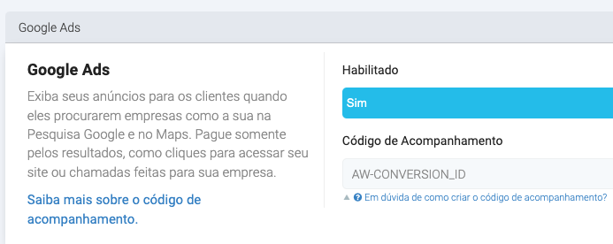 O código do acompanhamento tem o seguinte formato AW-CONVERSION_ID, onde o o código é o ID de conversão da sua conta.