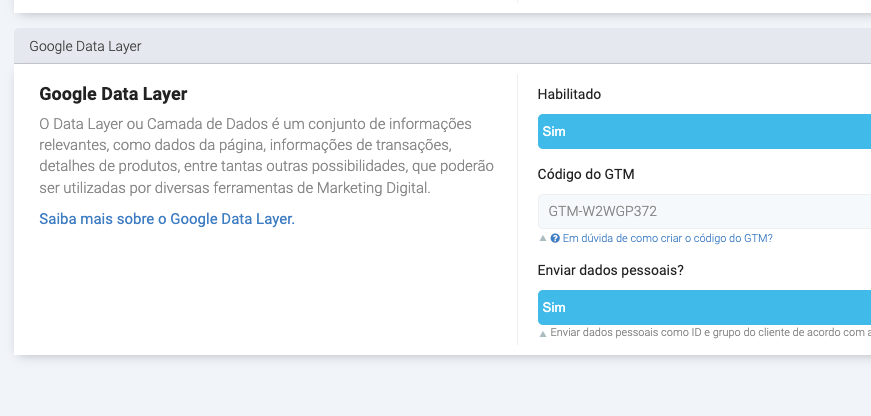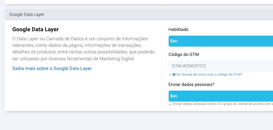 Basta você deixar o campo Habilitado como SIM, adicionar o GTM e ativar o Enviar dados pessoais.
