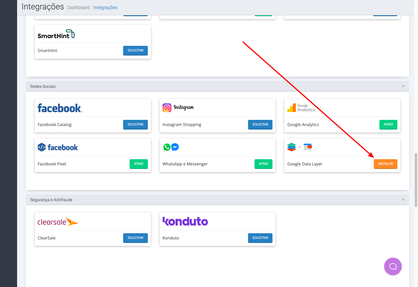 Caso não esteja instalado ainda na sua loja, basta acessar o menu Configurações, Central de instalações, Integrações, Redes Sociais. Identifique o item Google Data Layer e clique em instalar. Após instalar, é necessário deslogar do painel e logar novamente para liberar todas as permissões no seu usuário.