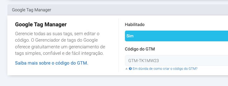 Basta você copiar seu ID, como em destaque acima -> GTM-TK1MW23 e adicionar no campo Código do GTM.