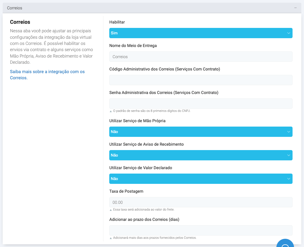 Nessa aba você pode ajustar as principais configurações da integração da loja virtual com os Correios. É possível habilitar os envios via contrato e alguns serviços como Mão Própria, Aviso de Recebimento e Valor Declarado.