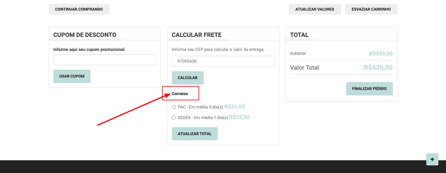 Nome do Meio de Entrega: Neste campo você pode personalizar o nome do método, que é exibido em todas as cotações de frete da loja virtual. No print abaixo é exibido no carrinho de compras da loja.