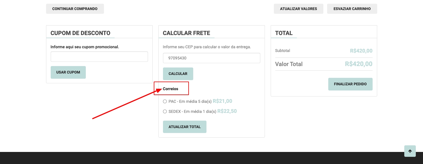 Título: Neste campo você pode personalizar o nome do método, que é exibido em todas as cotações de frete da loja virtual. No print abaixo é exibido no carrinho de compras da loja.