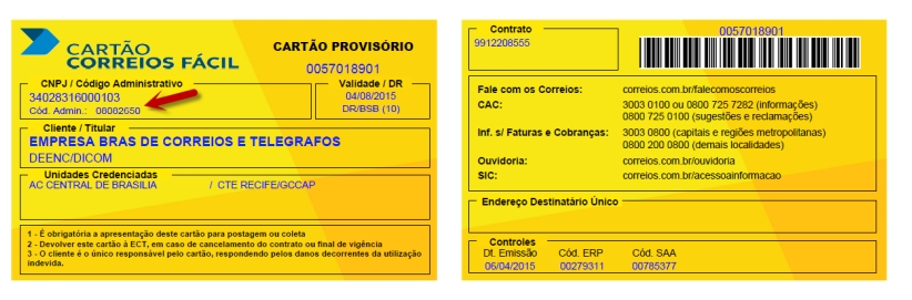 Código Administrativo dos Correios (Serviços Com Contrato): Neste campo você irá digitar o seu código administrativo. O Código Administrativo consta no seu Cartão de Postagem.