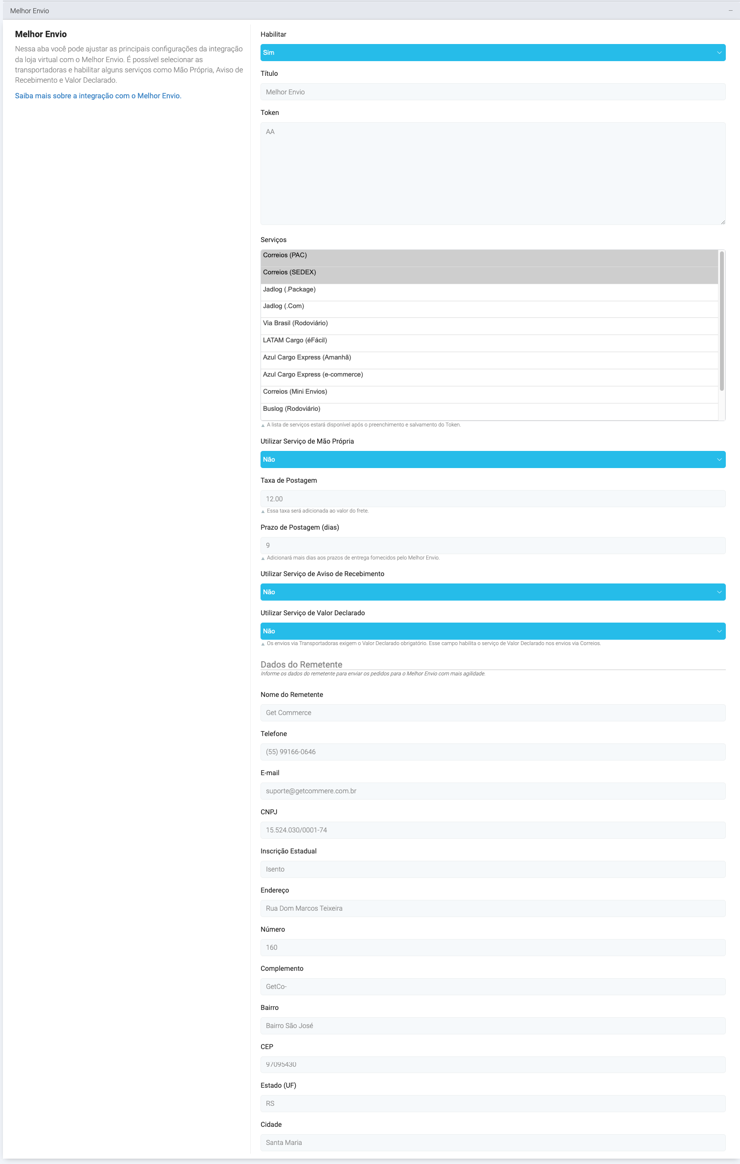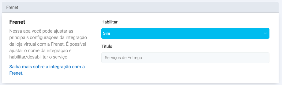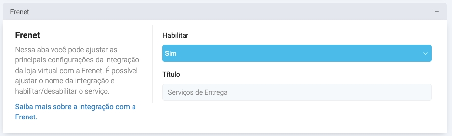 Nessa aba você pode habilitar a integração do Frenet com a Get Commerce.