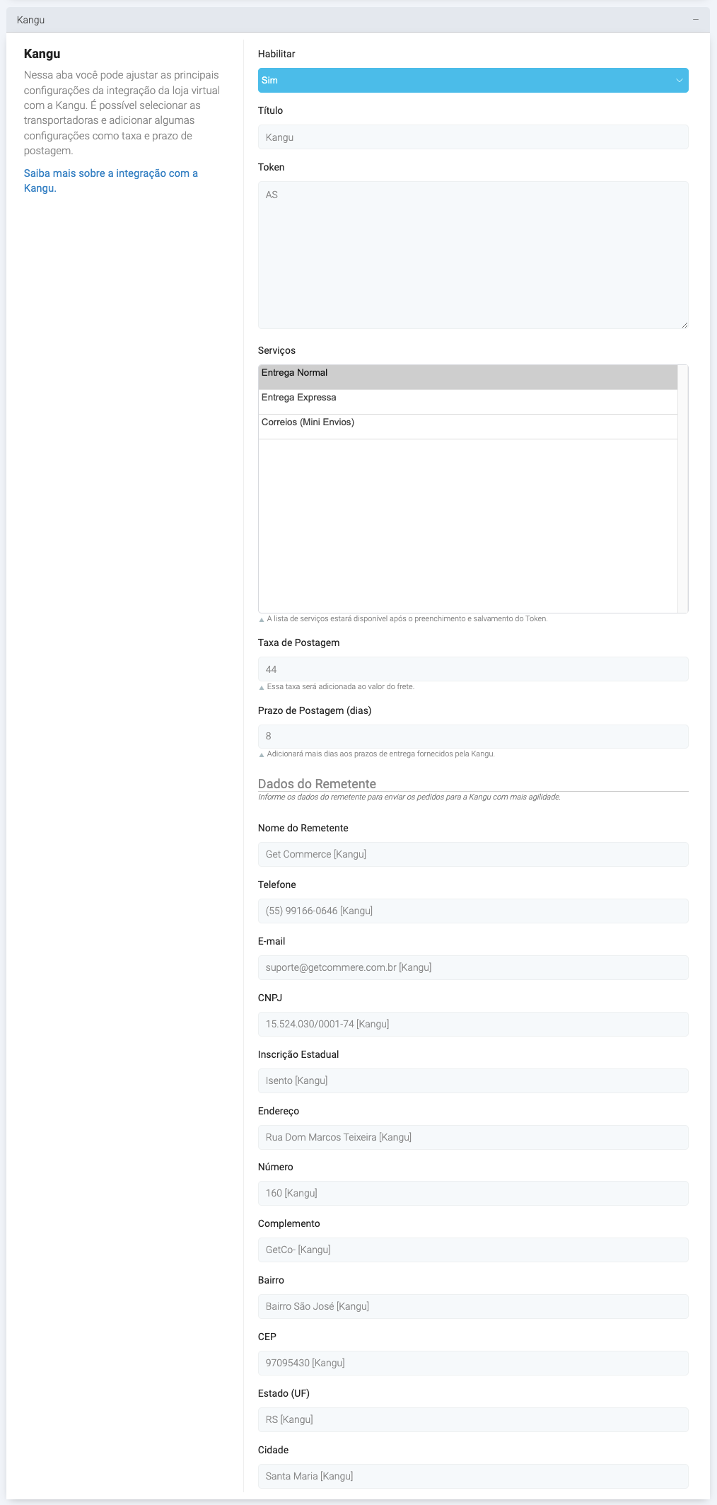 Taxa de postagem: Neste campo você pode inserir um valor adicional ao valor da cotação. Este valor será somado ao valor da cotação, exibido na loja. Ou seja, a cotação irá exibir o valor calculado pelo Kangu + a taxa de postagem. Em geral, pode ser utilizado para você adicionar um valor extra que cubra gastos com materiais usados nas embalagens. Este valor não aparece discriminado para o cliente que está cotando o valor do frete na loja virtual.