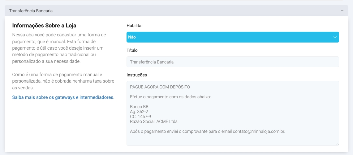 Instruções: Neste campo você pode escrever um texto personalizado com instruções de pagamento.