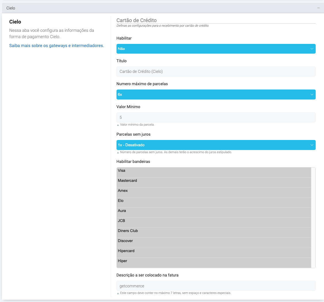 Nessa aba você pode configurar as informações da forma de pagamento da Cielo.
