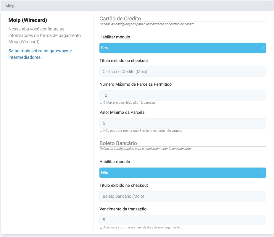 Nessa aba você pode configurar as informações da forma de pagamento do Moip (Wirecard). O Moip possui as opções de cartão de crédito e boleto disponível na integração com a Get Commerce.