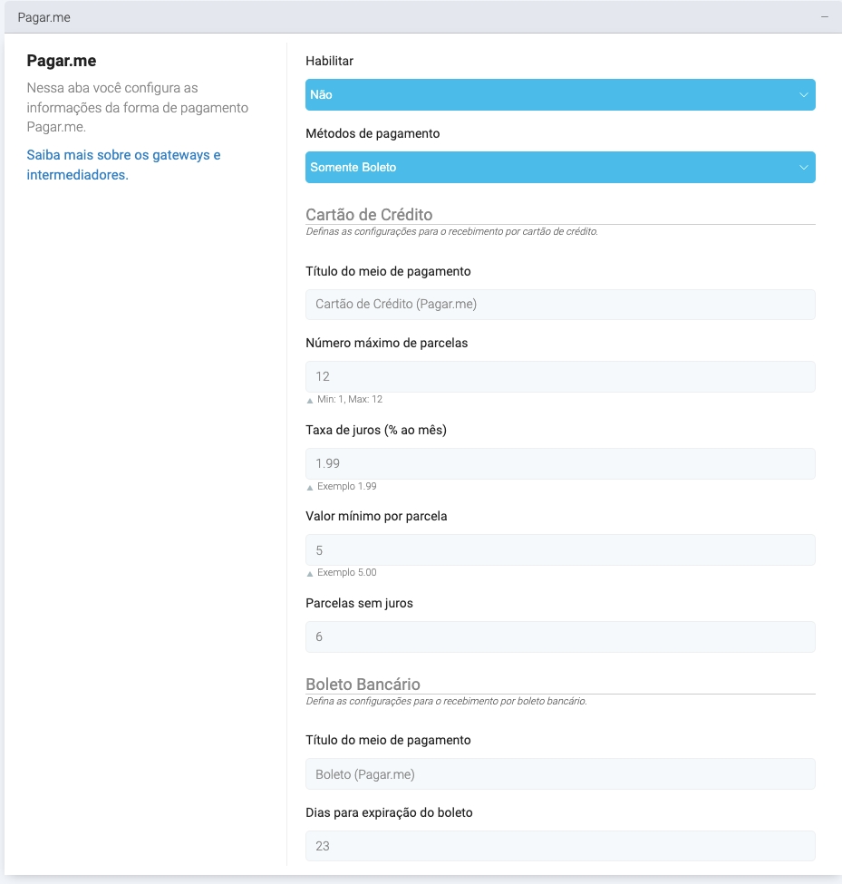 Nessa aba você pode configurar as informações da forma de pagamento do Pagar.me. O Pagar.me possui as opções de cartão de crédito e boleto disponível na integração com a Get Commerce.