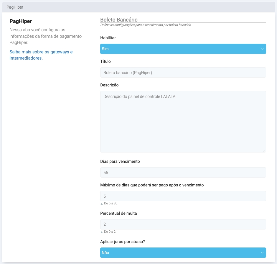 Nessa aba você pode configurar as informações da forma de pagamento do PagHiper. O PagHiper é uma forma de pagamento que possui apenas a opção de boleto disponível.