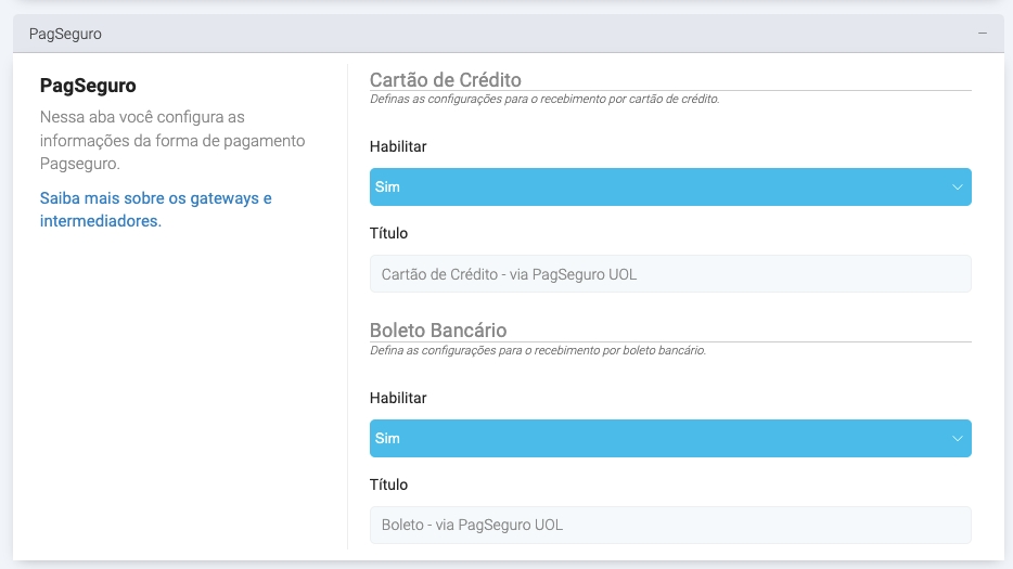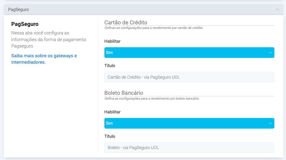 Nessa aba você pode configurar as informações da forma de pagamento do PagSeguro. O PagSeguro é uma forma de pagamento que possui cartão de crédito e boleto disponíveis, na integração com a Get Commerce.