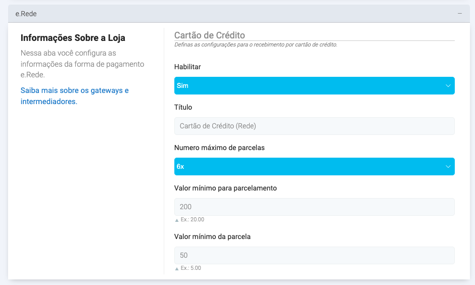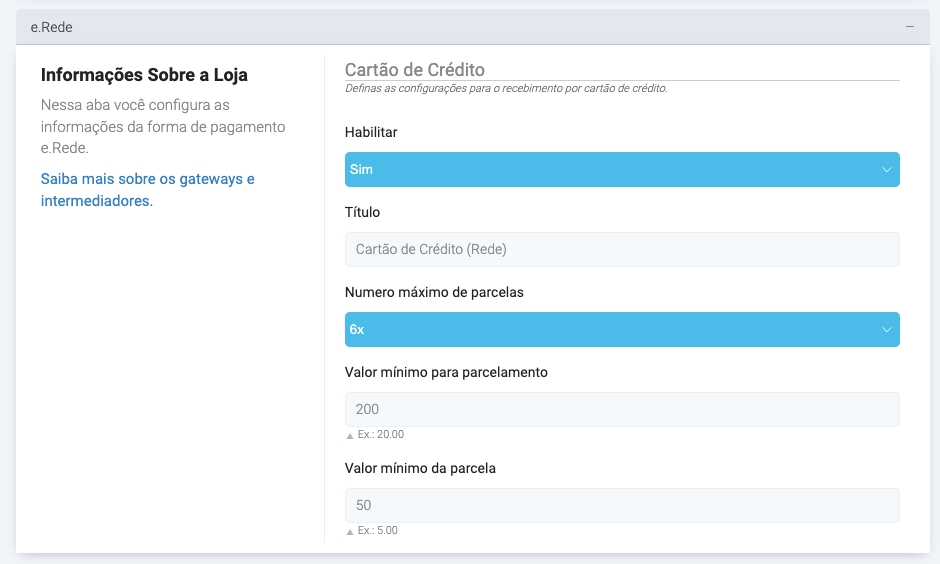 Valor mínimo para parcelamento: Neste campo você pode definir um valor mínimo global, para ser exibido o parcelamento para o cliente.