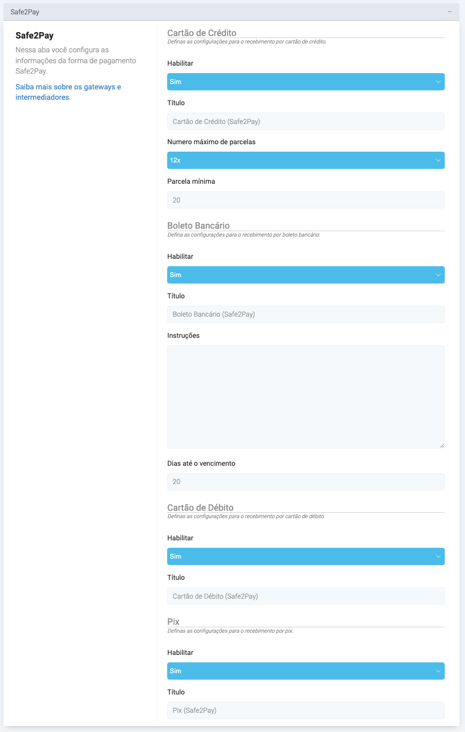 Nessa aba você pode configurar as informações da forma de pagamento da Safe2Pay. A Safe2Pay é a forma de pagamento mais completa na Get Commerce, possuindo os serviços de cartão de crédito e débito, boleto e Pix integrados conosco.