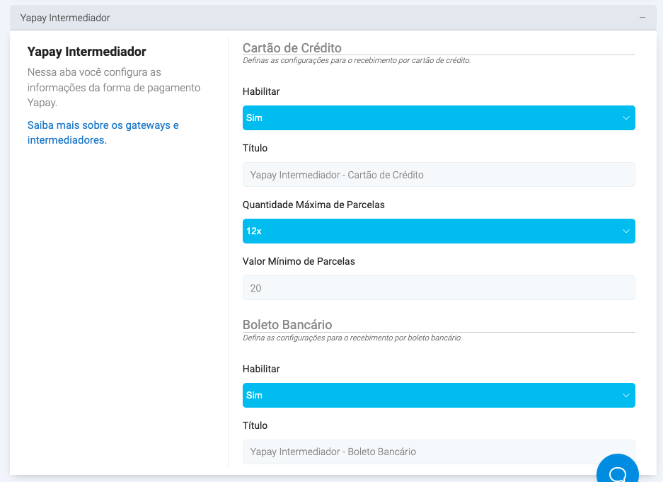 Nessa aba você pode configurar as informações da forma de pagamento da Yapay. A Yapay possui os serviços de cartão de crédito e boleto integrados com a Get Commerce.