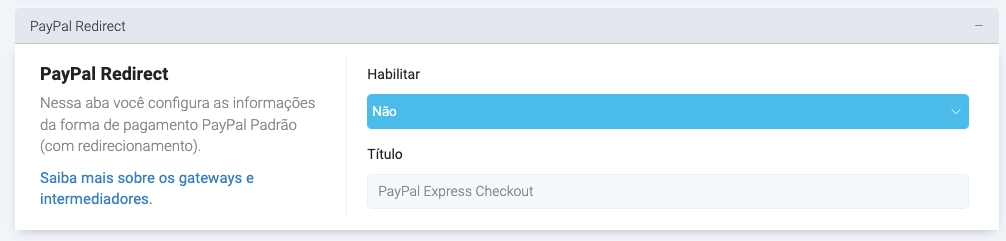 Nessa aba você pode configurar as informações da forma de pagamento do PayPal. O PayPal é uma forma de pagamento internacional, e possui apenas a opção de cartão de crédito disponível.