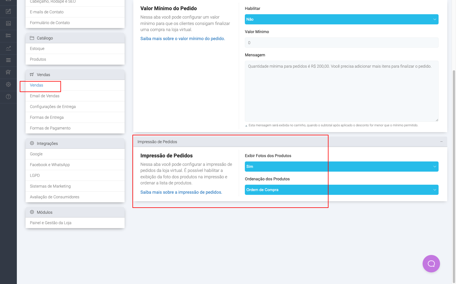 Nela é possível configurar 2 itens: Exibir fotos dos produtos e Ordenação dos produtos.