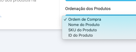 - Ordenação dos Produtos: permite você selecionar a ordem de listagem dos produtos, que possui 4 tipos: Ordem de Compra, Nome do produto, SKU do produto ou ID do produto.