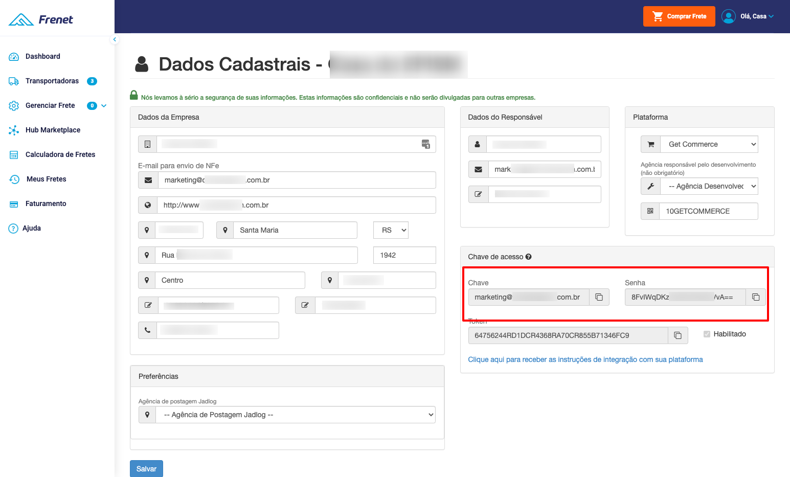PASSO 2: após realizar login no Frenet, clique no menu Dados Cadastrais, e identifique os campos "Chave" e "Senha".