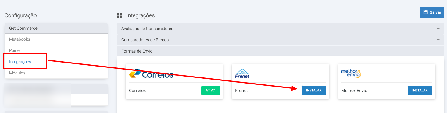 PASSO 3: Agora é hora de configurar na Get Commerce. Vá no menu Configurações, Configurações da loja, Central de Instalações, Integrações. Identifique a aba Formas de Envio, escolha Frenet e clique em "Instalar".