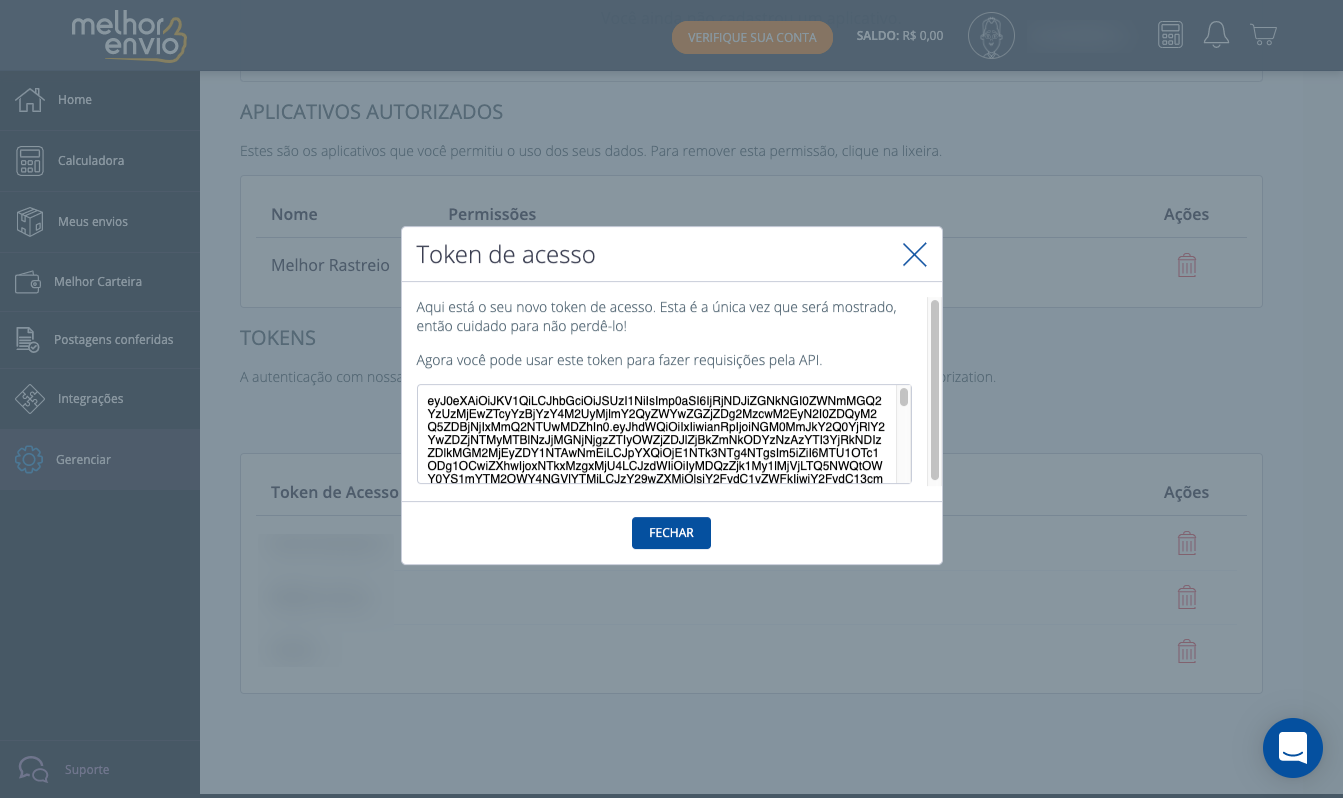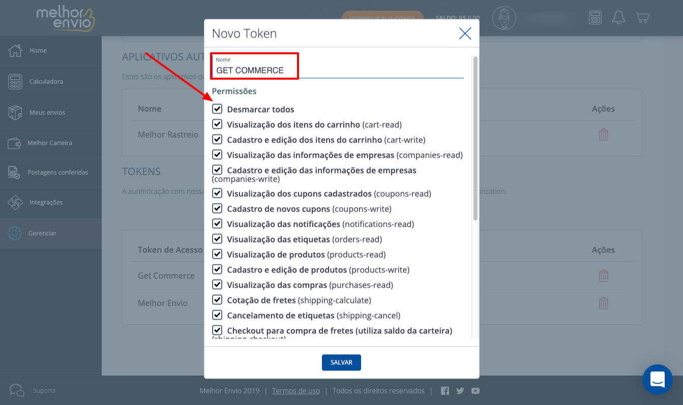 Acesse sua conta do Melhor Envio e vá no menu Integrações / Permissões de Acesso.