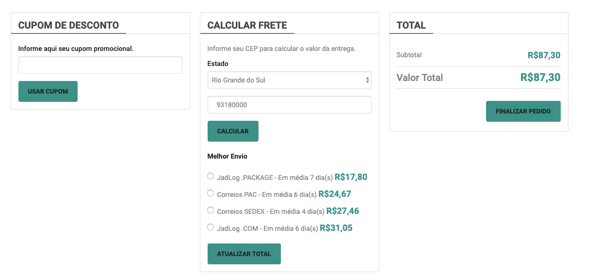 Os novos métodos de envio aparecerão para o seu cliente na tela do produto ou no carrinho de compras e checkout.