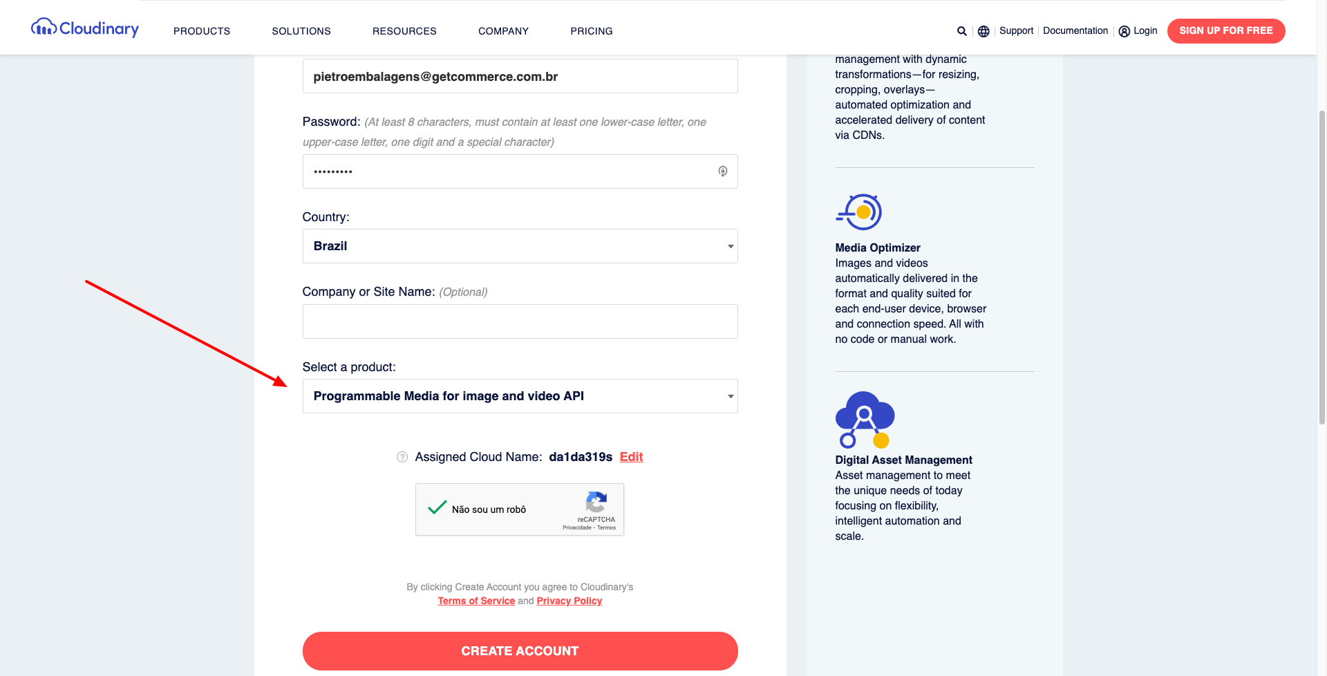 Atenção: é necessário que a conta seja do tipo "Programmable Media for Image and video API".