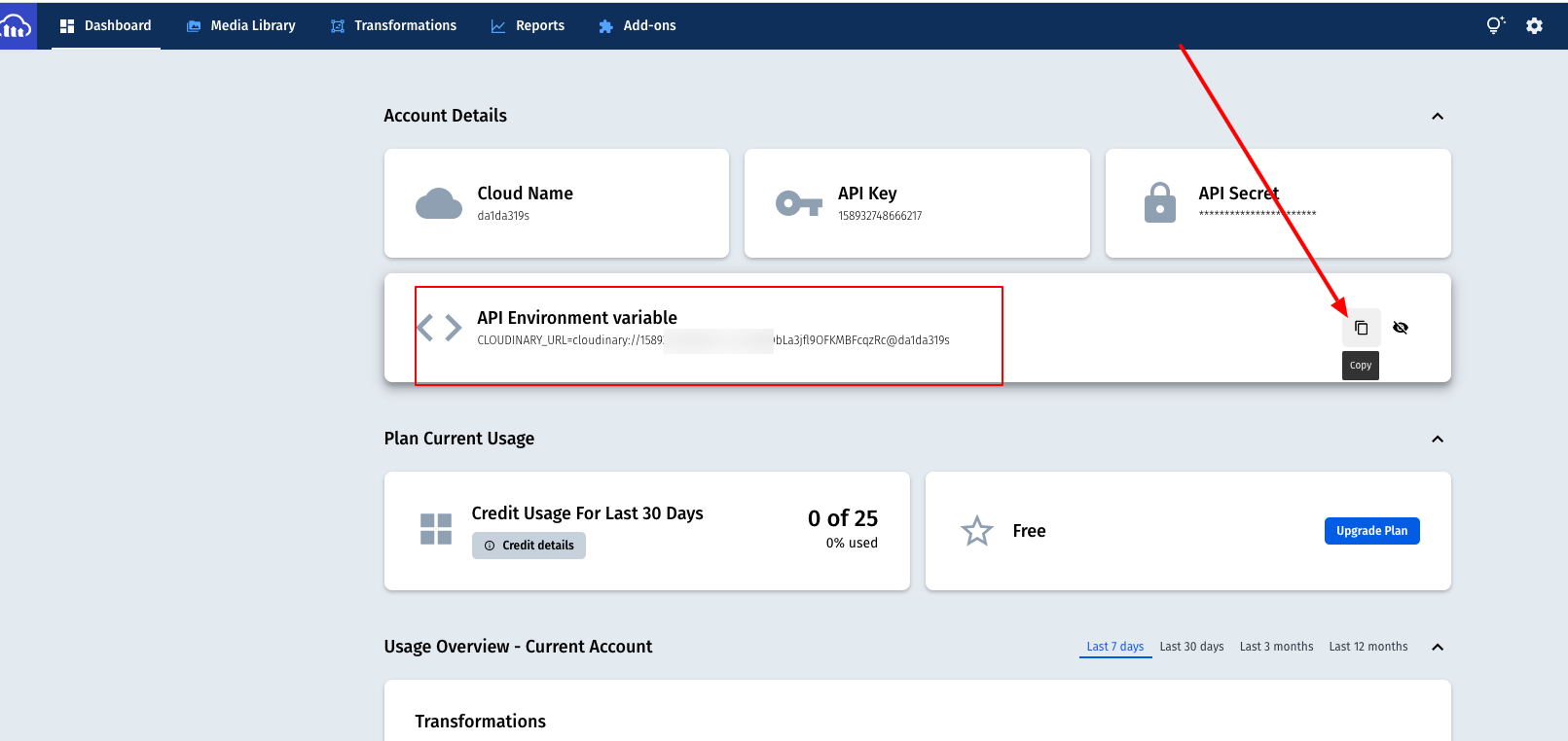 Cole sua Chave API e no último campo o seu email de login no Cloudinary.