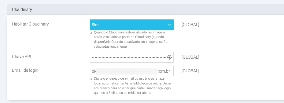 Para habilitar, marque SIM na opção Habilitar Cloudinary.