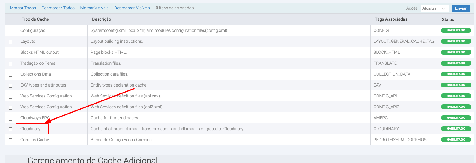 Passo 4: Acesse agora o menu Sistema, Gerenciar Cache e lembre-se de ativar a opção Cloudinary.