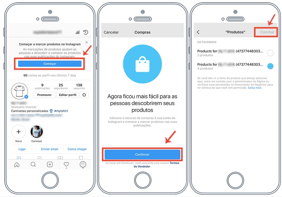 Então, você receberá essa notificação de Compras (primeira imagem), clique em “Começar”, depois “Continuar” (segunda imagem). Na aba seguinte (terceira imagem), ficarão a mostra todos os catálogos já adicionados no Facebook pelo sistema. Agora escolha qual deles você deseja vincular ao seu perfil do Instagram.
