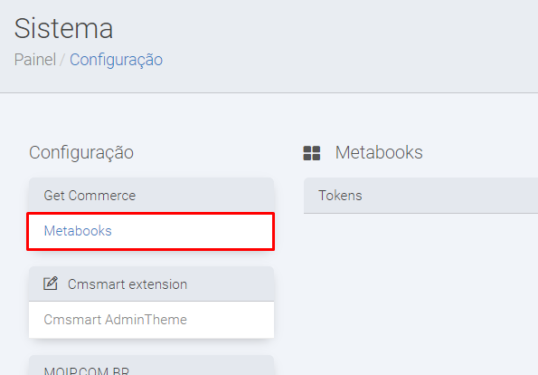Como integrar sua loja virtual com a Metabooks? Primeiramente iremos nos certificar de que o módulo está instalado na loja virtual (caso não esteja, solicite ao suporte da Get que instale). Para isso iremos acessar a aba Sistema -> Configuração e verificar se a aba Metabooks está presente.