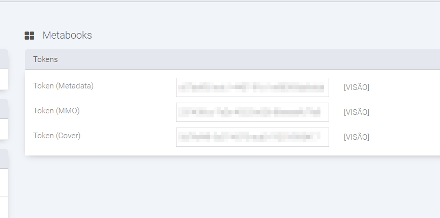 Após isso, iremos abrir o módulo e, na aba Tokens, vamos inserir os Tokens Metadata, MMO e Cover, estando estes disponíveis em sua conta no site da Metabooks.