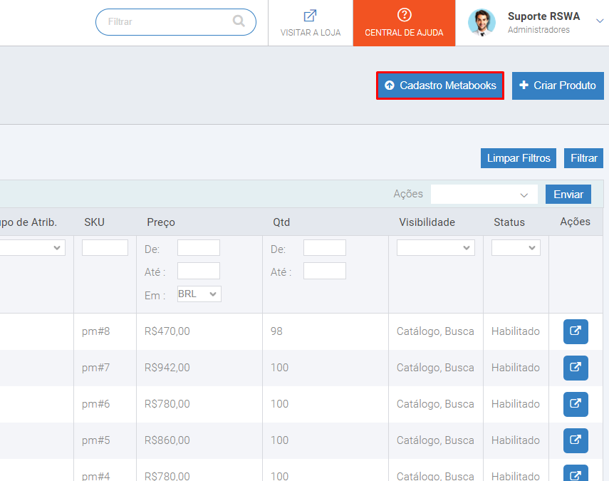 Para realizar a importação, acessaremos a aba Catálogo -> Gerenciar Produtos, onde iremos pressionar o botão Cadastro Metabooks.