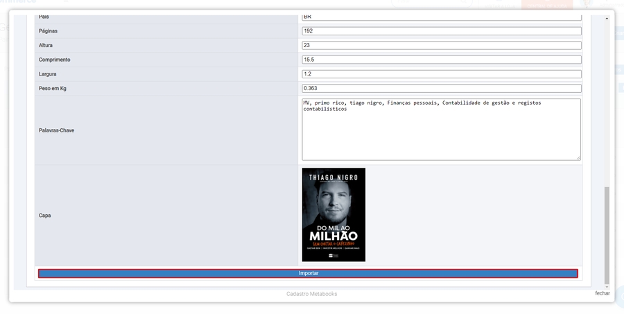 Ao clicar no botão Buscar, irá aparecer todas as informações do livro presentes do banco de dados da Metabooks, então poderemos importar o livro.
