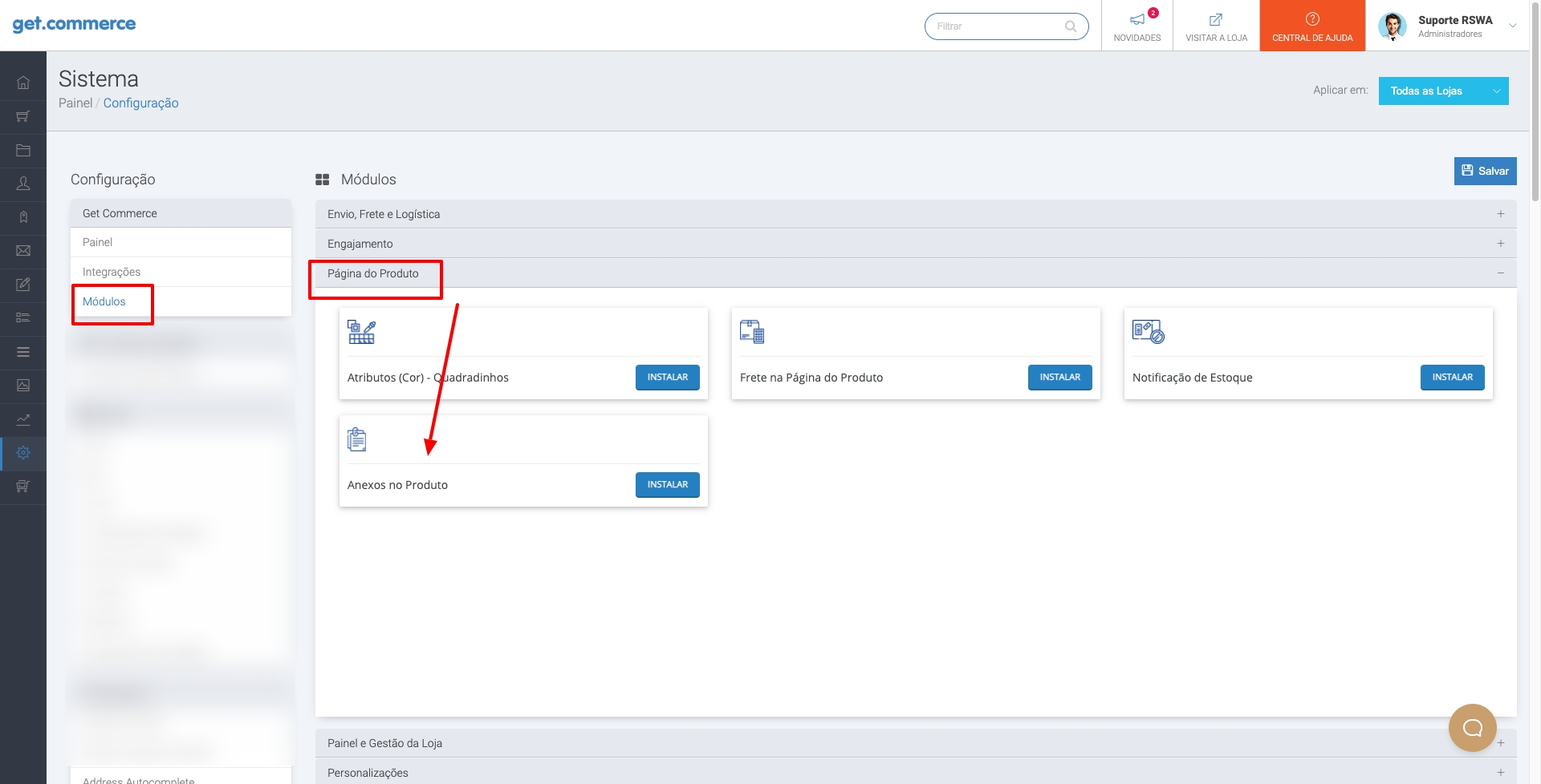 O módulo pode ser habilitado no menu Sistema, Configuração, Get - Módulos, Página do produto.