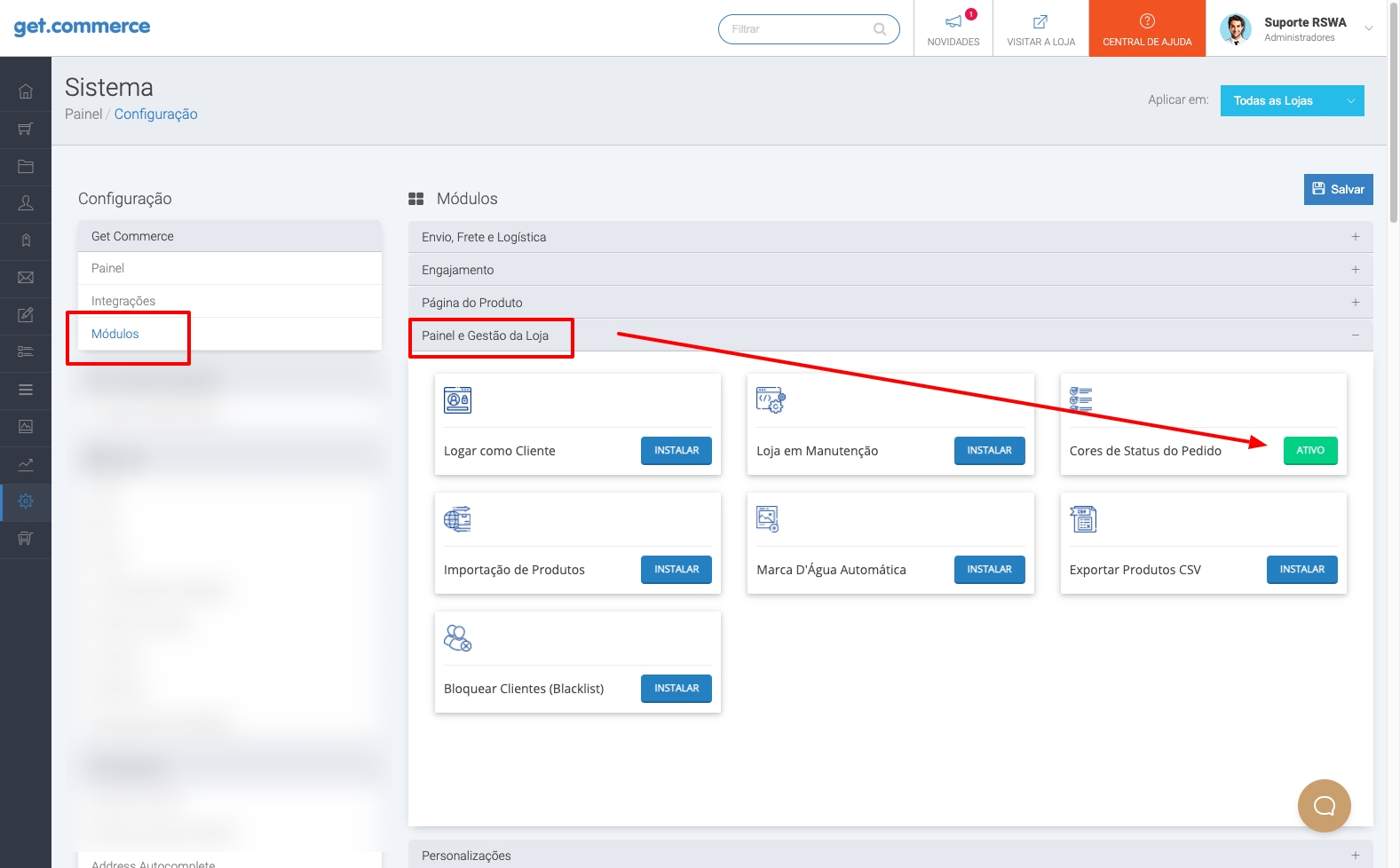 Acesse o menu Sistema, Configuração, Get Commerce - Módulos, Painel e Gestão da loja e clique em ativar.