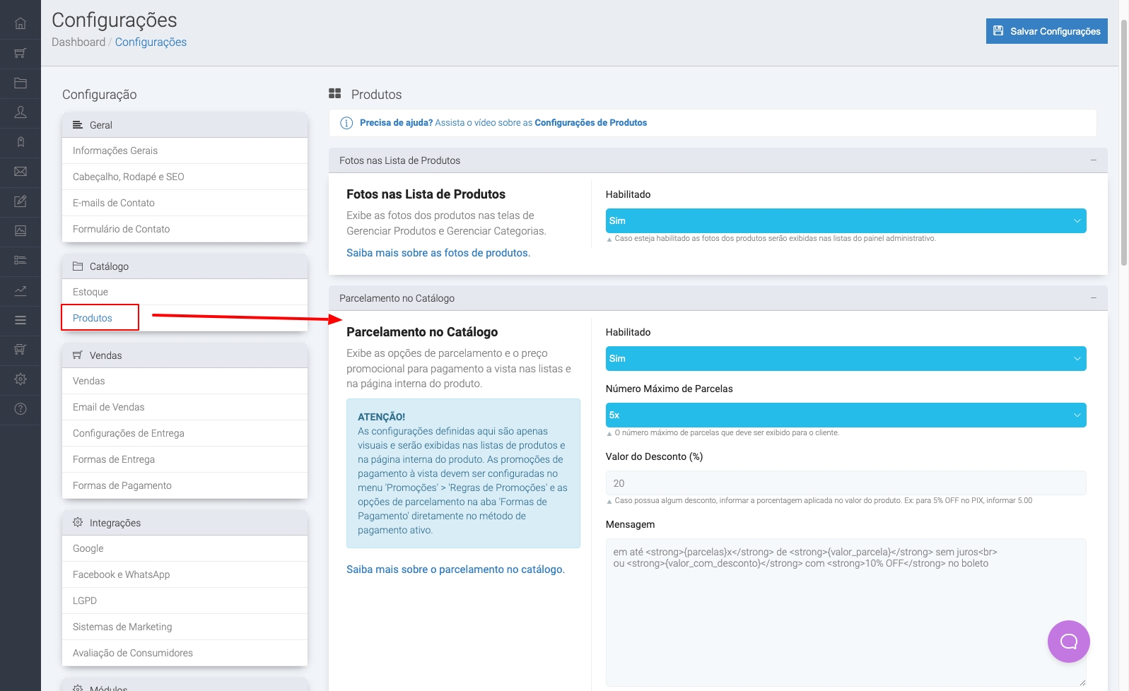 Para realizar a configuração do módulo acesse o menu Configurações, Configurações da loja e identifique a aba Catálogo, Produtos.