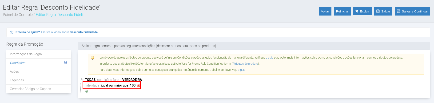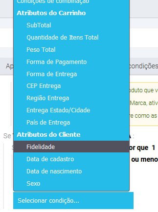 Após devidamente configurado, o módulo adicionará um atributo chamado "Fidelidade" em cada cliente da loja. Este atributo armazenará o valor gasto em compras pelo cliente no prazo configurado. Para utilizar este valor como condição de uma promoção basta acessar a aba "Condições" da regra e selecionar o atributo de cliente "Fidelidade":
