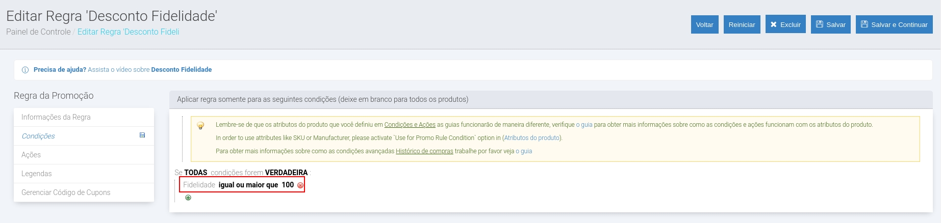 Agora você poderá, por exemplo, configurar a regra de promoção para funcionar apenas para clientes que tenham gasto no mínimo R$ 100,00 nos últimos X dias: