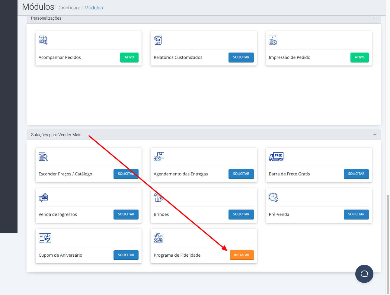 Acesse o menu Sistema, Central de Instalações, e procure na aba Soluções para Vender Mais o módulo.