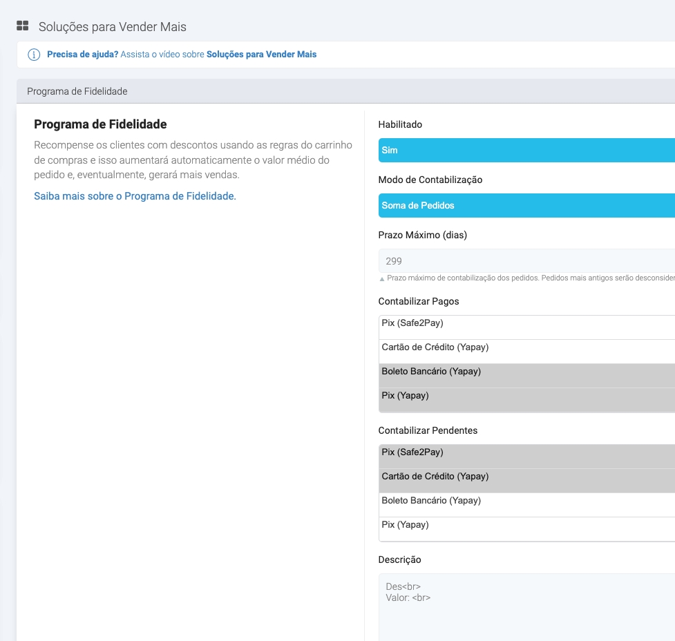 Para realizar a configuração do módulo acesse o menu Sistema, Configurações da loja e identifique a seção Soluções para Vender Mais. Clique na opção Programa de Fidelidade.